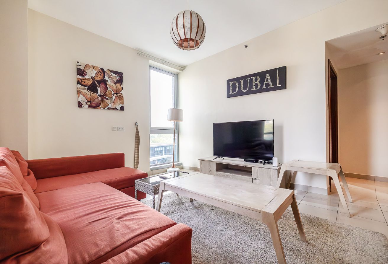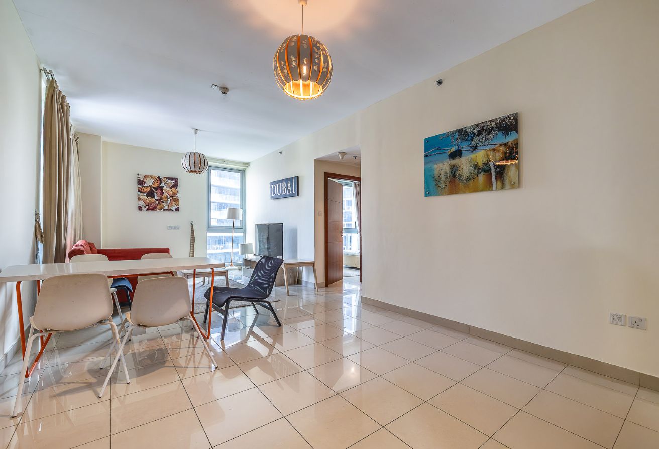 The apartment features a spacious and tastefully furnished living and dining area, designed for comfort and modern urban living. Large windows invite natural light and offer attractive community and city views, enhancing the open and welcoming ambiance.