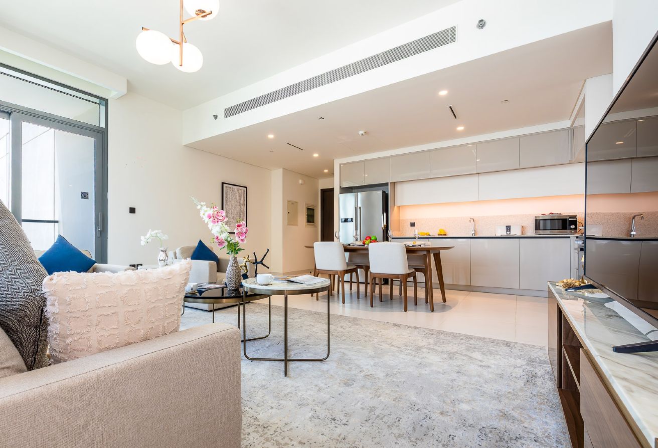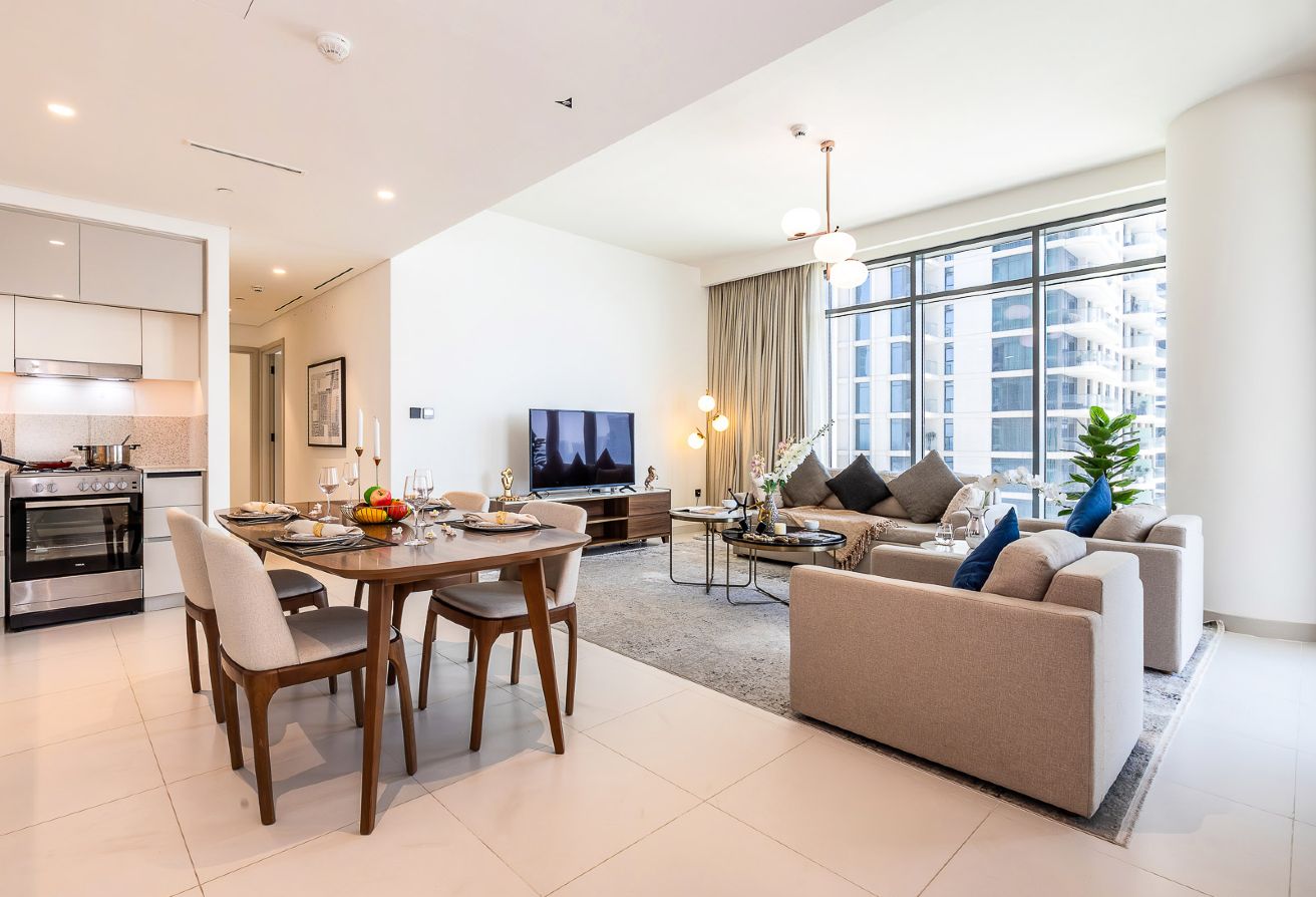 Spanning 1,277 sq ft, this beautifully designed residence offers a spacious open-plan living and dining area, tastefully furnished with premium interiors. Floor-to-ceiling windows open up to breathtaking sea and marina views, creating a bright and serene living environment. The modern kitchen comes fully equipped, while both bedrooms feature built-in wardrobes and elegant finishes.
