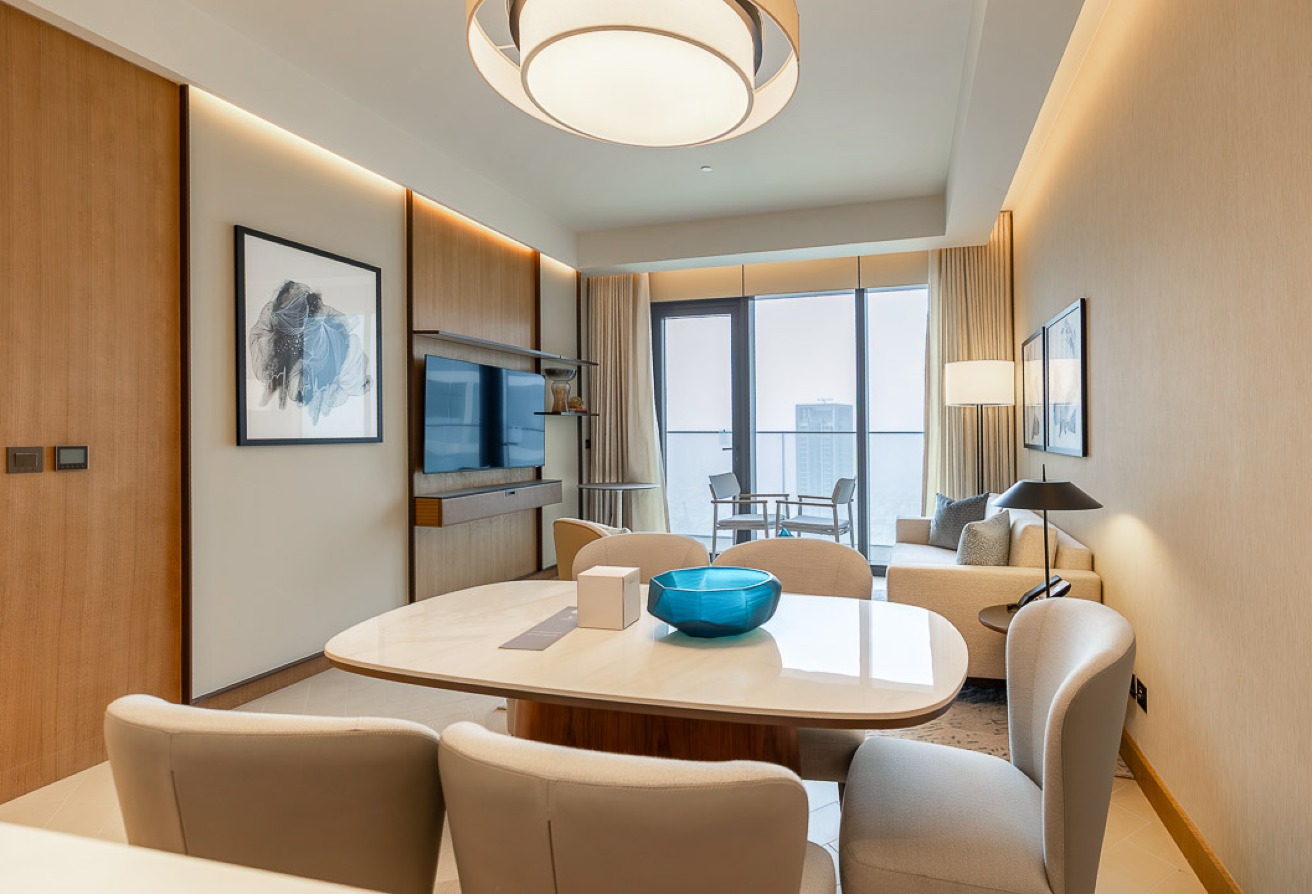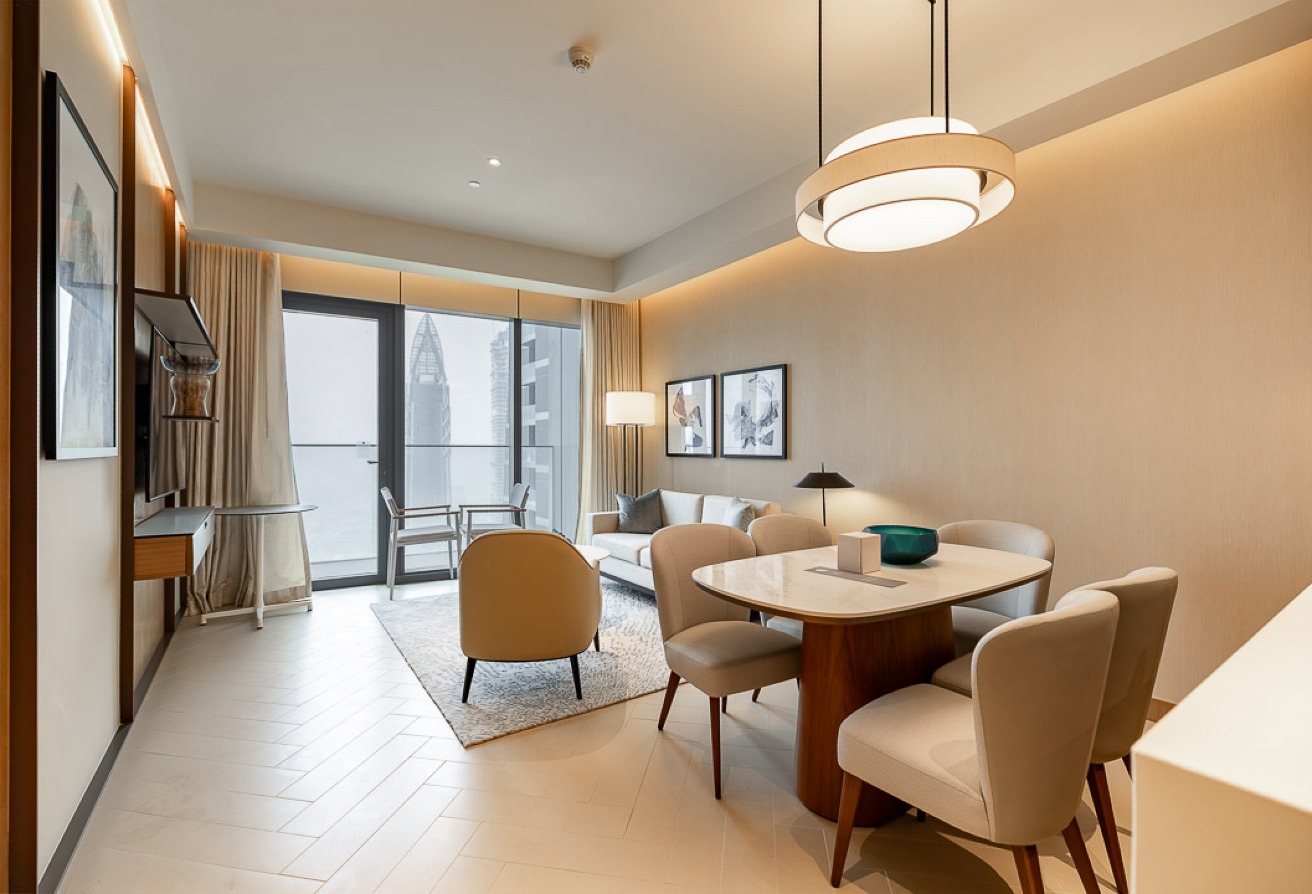 The apartment features a spacious open-plan living and dining area finished with premium materials and contemporary design elements. Floor-to-ceiling windows allow abundant natural light and open onto a private balcony, offering impressive Downtown and skyline views.