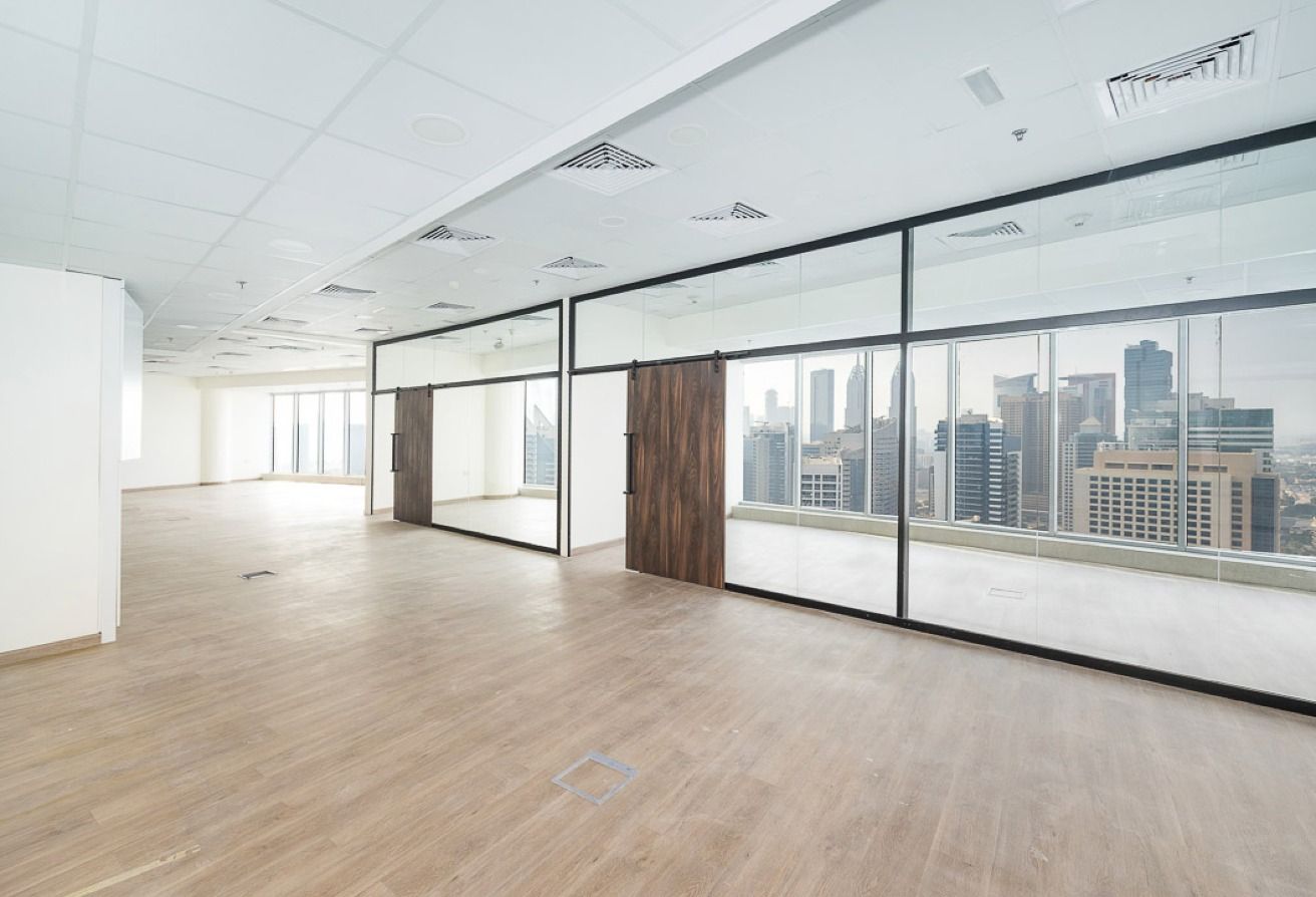 Spanning 823 sq ft, the office features a fitted layout with high-quality finishes and a flexible floor plan suitable for private offices, collaborative workspaces, and meeting rooms. Floor-to-ceiling windows provide panoramic sea and skyline views, flooding the space with natural light and enhancing the professional working environment.